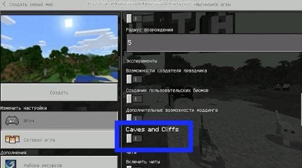And then, before creating the world, turn on the "Caves and Cliffs" slider. After that, some features from the future version of the game will appear in your game.