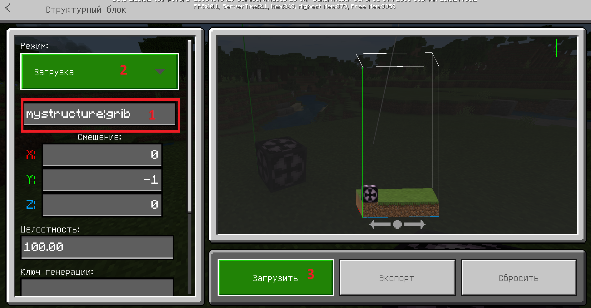 Then choose where you want to insert your object. Set there the building block, and in the tab "mode" select "load" and write in the names of the object that you copied, and the system Minecraft sama all will understand, then click on "load".![]()