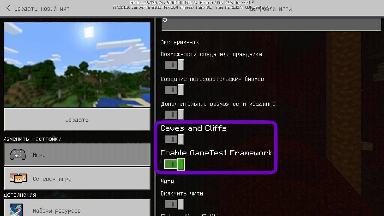 In the beta versions of Mynecraft PE, there is a new mode "Caves and Cliffs" when creating a world. And with it, you will be able to add innovations from the upcoming update.
