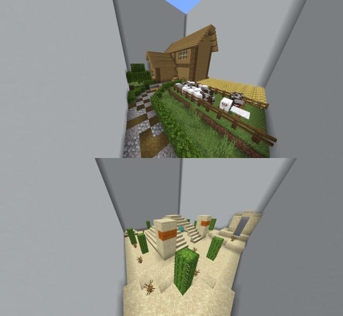 Below you can see some screenshots showing the appearance of some of the levels of this Minecraft PE (Bedrock) map, in which you will need to find a button: