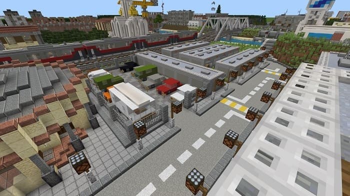 Map Russ Big City New includes a Russian city - Oktyabrsk in Minecraft PE (Bedrock), there will be a train station, factories, cafes and so on. The city is quite so and big and technological, you can go there and walk around.
