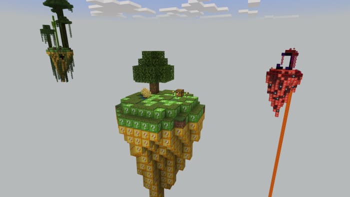 The Lucky Skyblock map will allow you and your friends to fight in unique PVP mode in Minecraft PE (Bedrock)! You will be on the sky islands, which are made up of lucky blocks. And each player needs to evolve on their island to battle you.