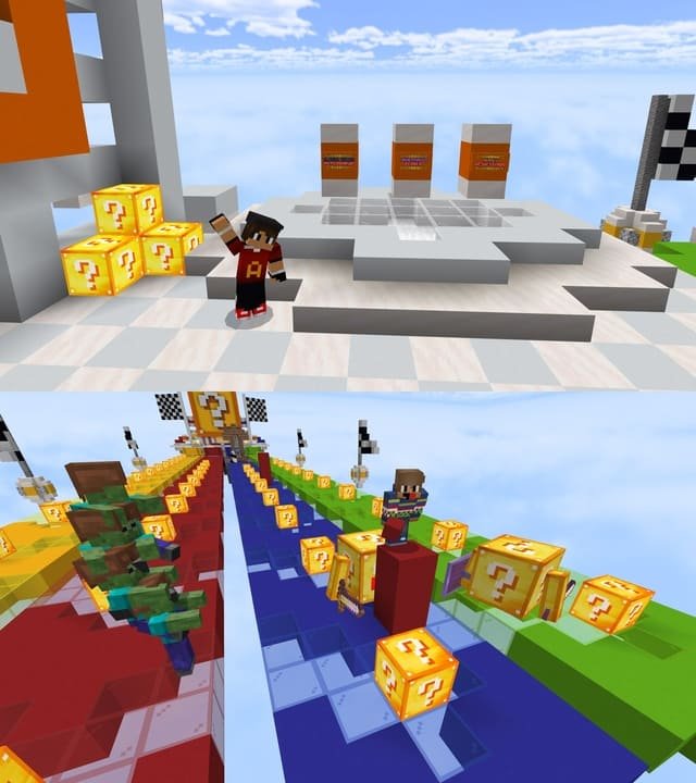 The Lucky Blocks Race map for Minecraft PE (Bedrock) allows players to compete in a unique mini-game. Players run on individual tracks, smashing lucky blocks, which can both encourage valuable items and complicate the passage with unexpected difficulties.