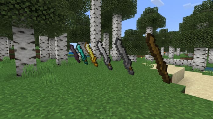 Each sword will be unique and have cool features in Minecraft PE (Bedrock). And also, you can create these weapons from any ore, and also, with the help of blacksmith table to improve them.