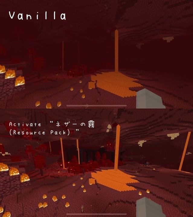Here we have given an example screenshot of the environment in the Netherworld using these resource sets for Minecraft PE (Bedrock) and also without them, to clearly demonstrate the difference and superiority of this tool.