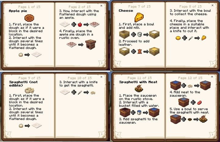 The latest version of the DecoDrop modification for Minecraft PE (Bedrock) added decorative food blocks, which must be created using recipes from a special book. It is crafted from two knives (with which you can slice some blocks and eat) and one book with a feather. It contains instructions on how to cook certain dishes, which foods to use and which blocks to interact with for cooking.