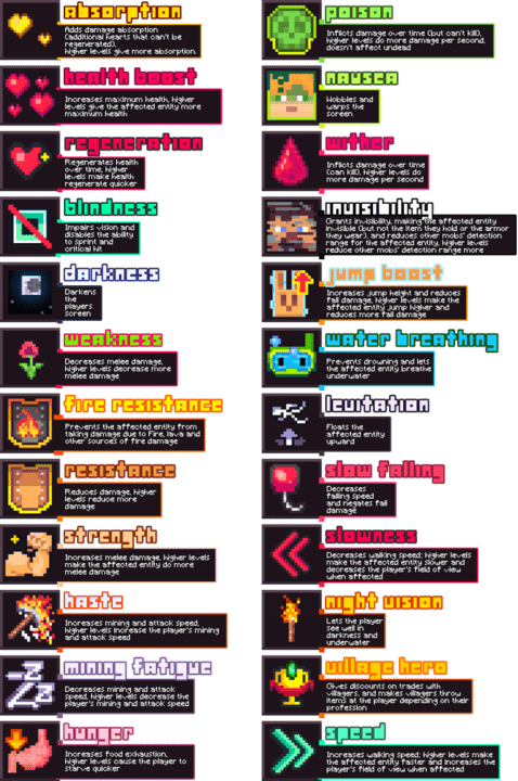 These textures only work on the icons of possible effects obtained in the world of Minecraft PE (Bedrock) or from potions. Now these icons will be more "fresh" in their appearance and currently the set includes an update of icons of all 24 statuses.