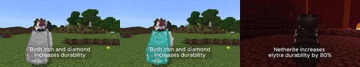 Iron elithrons are 40% more durable than normal, diamond elithrons are 60% more durable, and neserite elithrons are 80% more durable and give you fire resistance (you'll be able to fly through even a lava flow).
