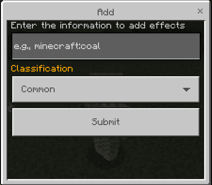 Open the mod menu with the command !dp in chat and select the section "Add", in the field enter the ID of the item in Minecraft, for example, minecraft:coal and select the rarity level:
