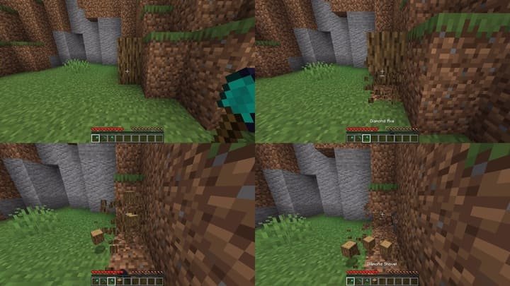 Your shovel, pickaxe or axe will be automatically replaced to break all kinds of blocks almost instantly and efficiently: