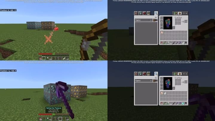 This section will demonstrate in practice the very process of the mod. The screenshots will show how things instantly automatically appear in the inventory, instead of falling out on the ground. In turn, this saves a lot of playing time in Minecraft PE (Bedrock).