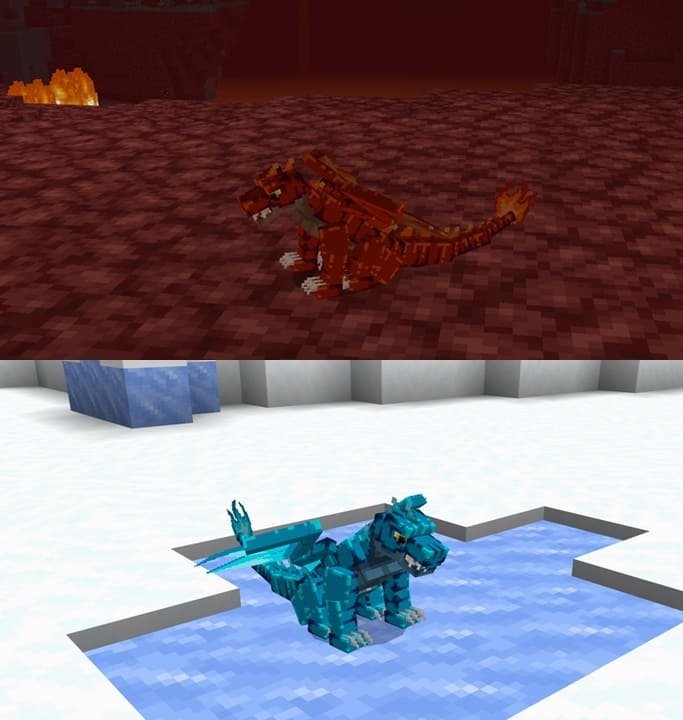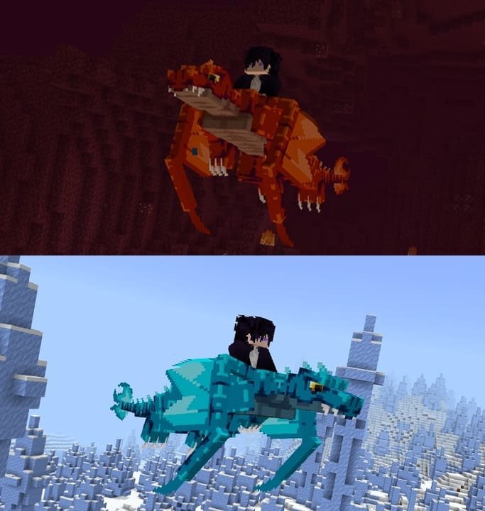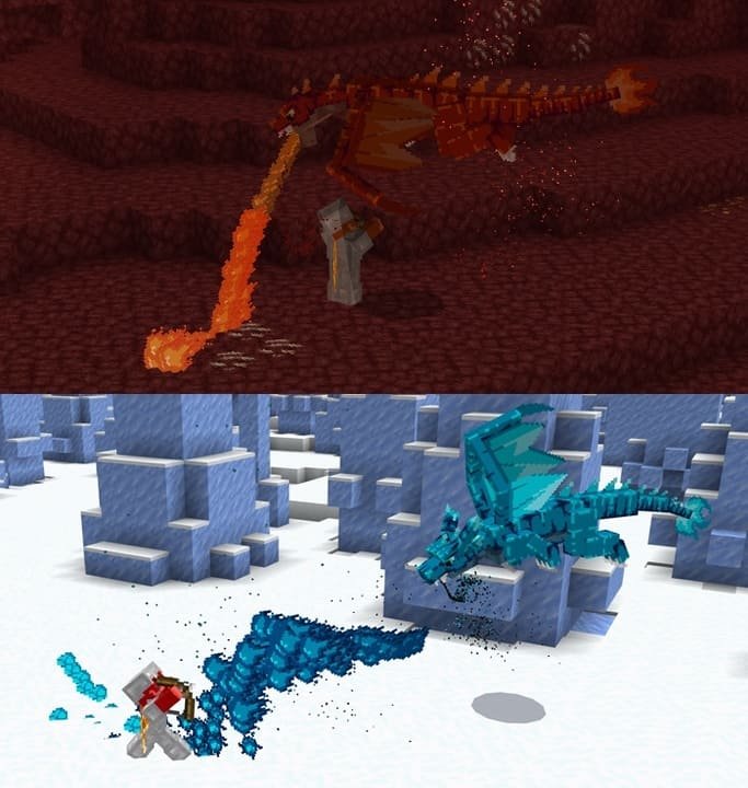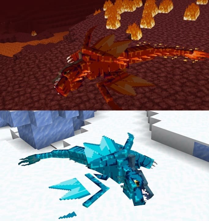 With this mod you will be able to encounter only two types of dragons in the world of Minecraft PE (Bedrock): Infernal - attacks with fire in the Lower World, and Frost - attacks with ice fire in the winter biome of ice spikes. All dragons can fly and will attack the player, but you can get eggs and resources when killing them.