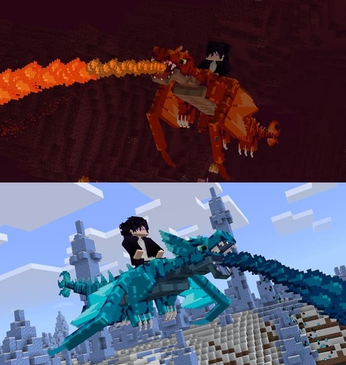 Thanks to this Minecraft PE (Bedrock) add-on you will be able to fight dragons, get their eggs to tame your own dragonlings, and later fly them and exterminate your enemies with fire when they grow up.