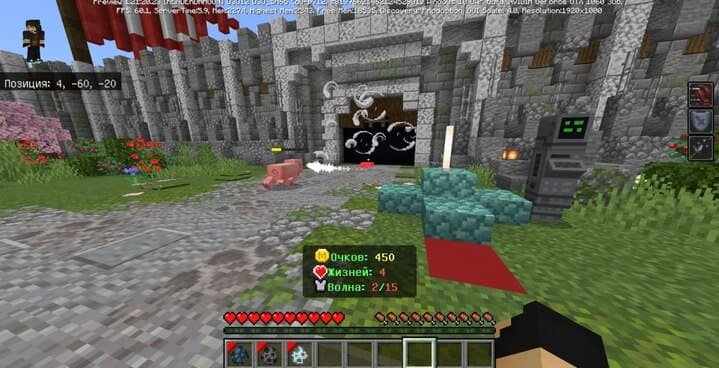 The task of the Tower Defense minigame map for Minecraft PE (Bedrock) is to prevent the mobs from reaching the opposite exit. To do this, build and pump turrets with generators and try to hold off the onslaught for only 5 lives out of 15 waves.
