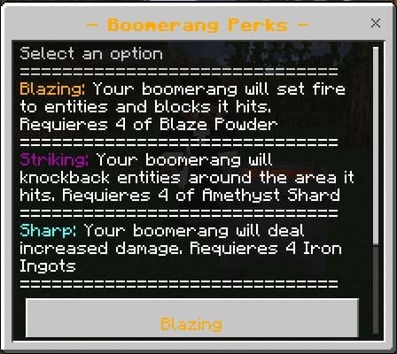 In addition to in-game enchantments, the player can also add one of three unique effects to their boomerang in Minecraft PE (Bedrock) that will give different abilities to your attacks: sharpness, discarding, and burning.