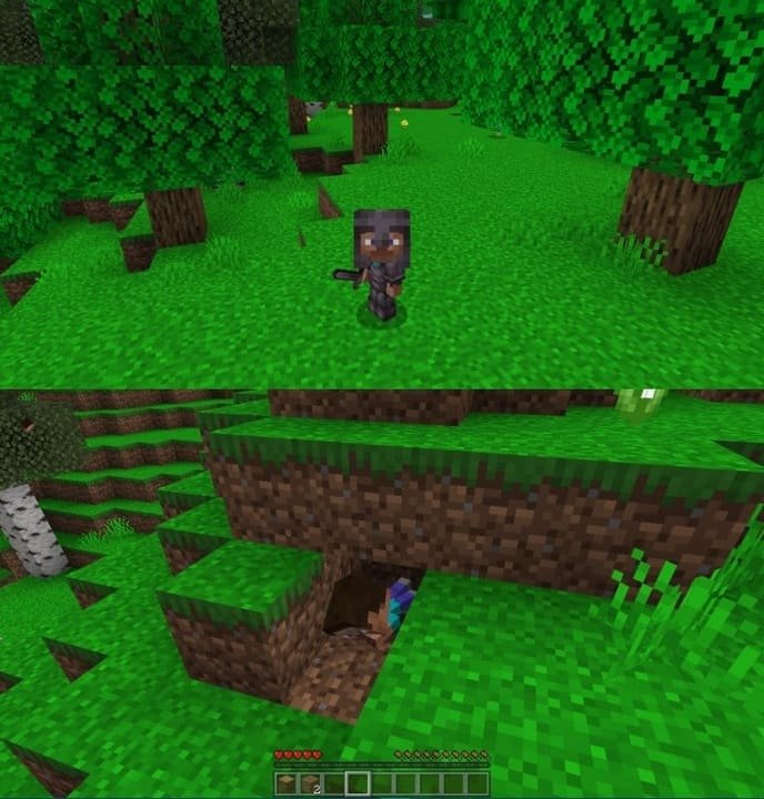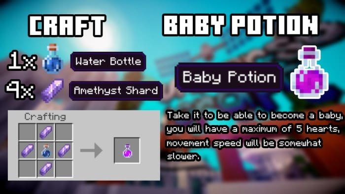 The main functions of this Transform into Baby! mod are based on two magic potions in Minecraft PE (Bedrock) - the baby potion and the adult potion. When you drink the diminishing potion, you will be able to pass into 1x1 spaces and have half as many hearts.