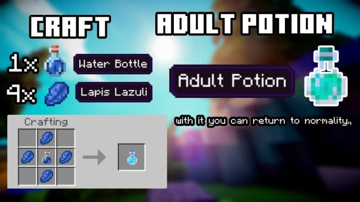 Similarly, to create the adult potion, you will now have to use 4 lapis lazuli and also 1 water bubble in Minecraft PE (Bedrock). Only the crafting of this potion will help you turn into a regular character from a child and regain all other properties.