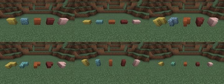 This mod offers a variety of new building elements in Minecraft PE (Bedrock), including vertical slabs, half-slabs, connecting ladders and quarter cube blocks.