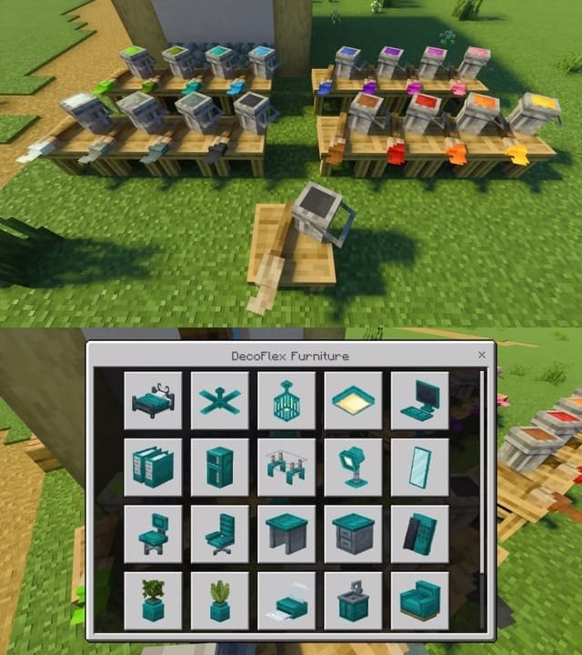 Modification DecoFlex Furniture for Minecraft PE (Bedrock) presents a variety of furniture elements that will fit perfectly into any modern building. All items can be repainted in different colors, using a special paint and brush.