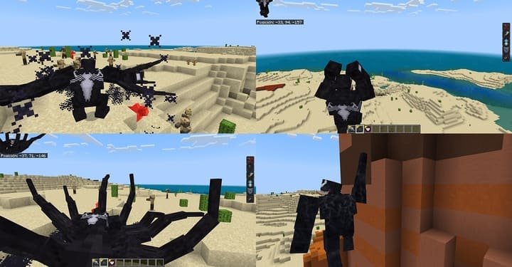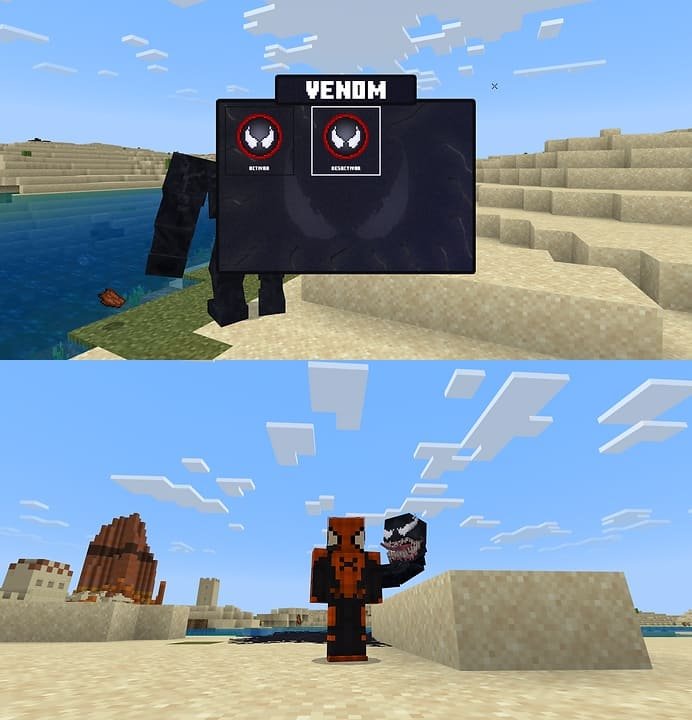 Modification Venom on the game Minecraft PE (Bedrock) provides players with the opportunity to become Venom, a famous character from the Marvel universe. Thanks to this addition, you can not only change the appearance of the character, but also get access to powerful combat abilities such as melee attacks, symbiote explosion and air strikes.