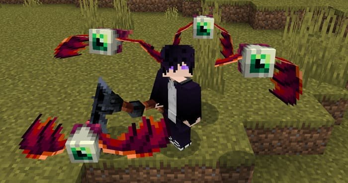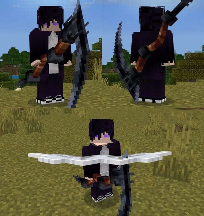The scythe you receive deals a base damage of 9 damage, and can also use special attacks. These include powerful air strikes and the ability to summon eyes for 30 seconds. Scythe can also be given additional effects via enchanting in Minecraft PE (Bedrock), making it even more deadly.