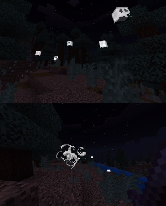Ghosts appear on the surface at night and can attack the player or scare other creatures in Minecraft PE (Bedrock). They carry a random item that keeps them alive and disappear at dawn.