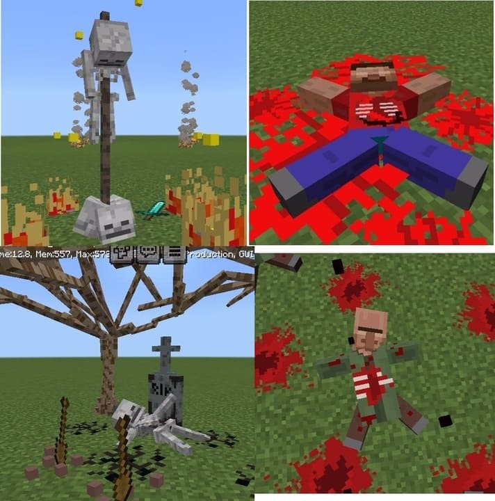 Dead bodies are ideal for horror maps, where every detail is important to enhance the atmosphere of fear in Minecraft PE (Bedrock). They can be used in locked rooms, dark dungeons or terrifying locations, making the mod useful for creating more frightening and exciting scenarios.