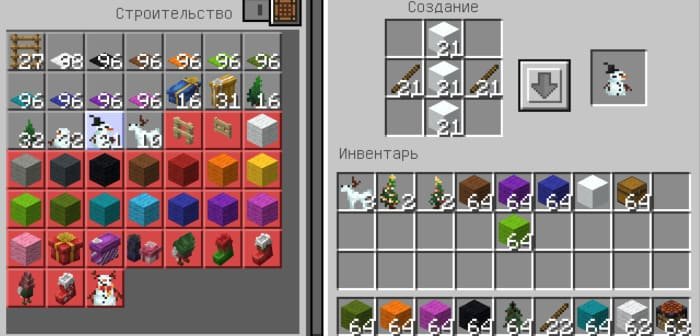 Modification DecoChristmas for Minecraft PE (Bedrock) will bring the spirit of Christmas and New Year to your game. With this mod you will get a lot of decorative items such as Christmas trees, snowmen, gifts and socks, as well as colorful garlands with different glow modes.