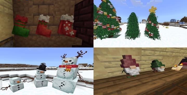The mod offers animated garlands with three modes: fully on, flickering and off. They have a lighting level of 9 when on. Also added are large Christmas trees and snowmen, which are mobs and are installed using special items.