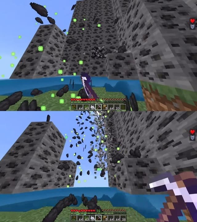 One of the main features of this modification on Minecraft PE (Bedrock) is that mass mining in one click works only while crouching and at the same time spends the strength of the tool for each broken block (up to 64 at a time).