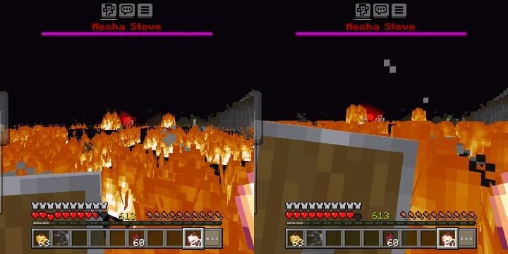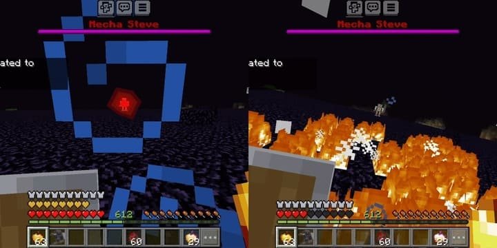 Mecha-Steve has a "false death" phase in which it falls to the ground and feigns inactivity, but then suddenly attacks, making the player nauseous. The ranged mode features powerful explosions comparable to the power of the End-Crystal that pierce shields.