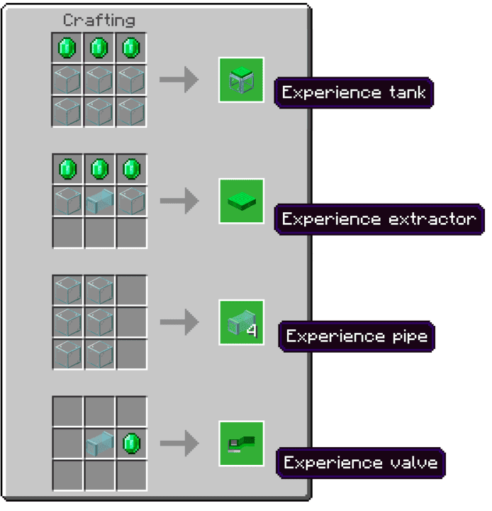 The main element of the mod is the XP tank, which stores experience in the form of points rather than levels. The player can fill it by sitting on it or on the XP extractor. Experience can be extracted by installing a pipe under the tank, using the XP valve or pouring it into bottles.