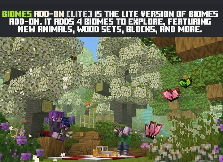 The Biomes (Lite) modification for Minecraft PE (Bedrock) adds 4 new biomes, expanding the natural diversity of the game world. Explore unique locations with new trees, animals, vegetation and materials. Now nature will become even more colorful and realistic!