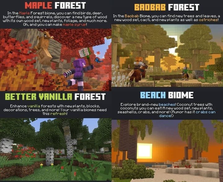 ■ Updated Vanilla Forest - improved classic biomes with new vegetation, trees and scenery.