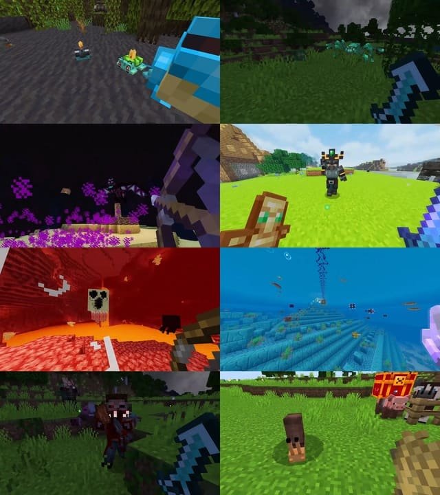 Exclusive rare mobs have been added, such as the Golden Pig with a Chest or the Clown Champion. Each creature can now have glowing elements, new movement animations and detailed Minecraft PE (Bedrock) style textures.
