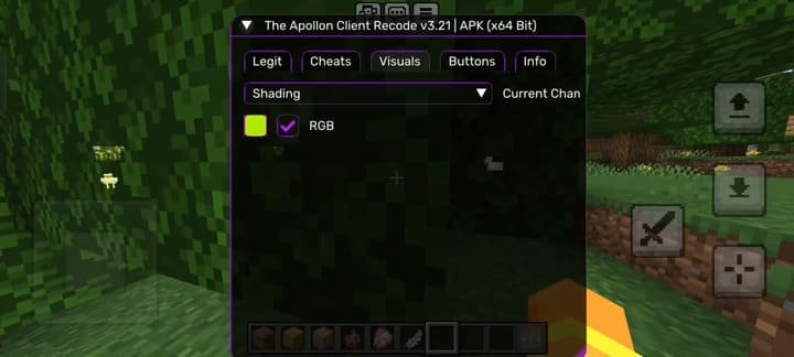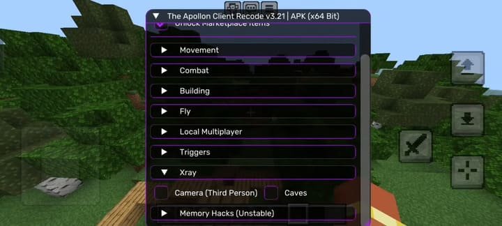 Apollon client adds Cheats for Minecraft PE (Bedrock) - many cheat features including: Killaura, Ladder Fly and X-Ray. These cheats provide increased performance, support for 32/64-bit devices and improved visuals for PvP and survival.