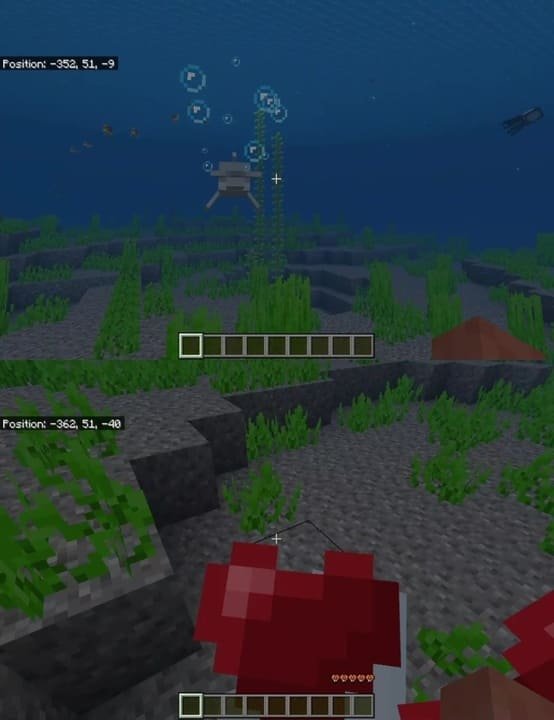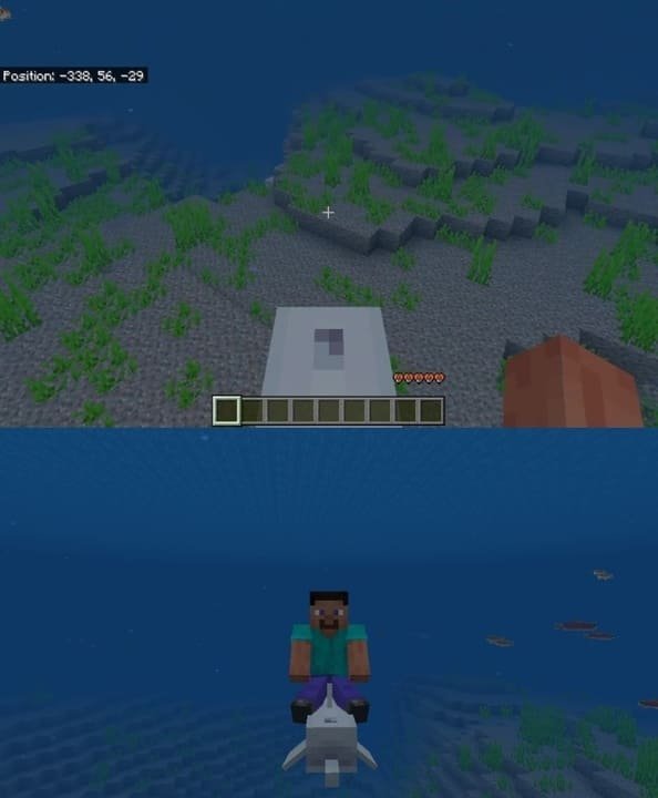 First of all, you need to tame the dolphin - the process is similar to taming horses or donkeys in Minecraft PE (Bedrock). Simply approach it and press "interact" without holding the fish in your hand. After a few seconds, red hearts will appear, which means you have successfully tamed it, or it will fall off and you will have to try again. Treat the dolphin with a fish to increase your chances of success.
