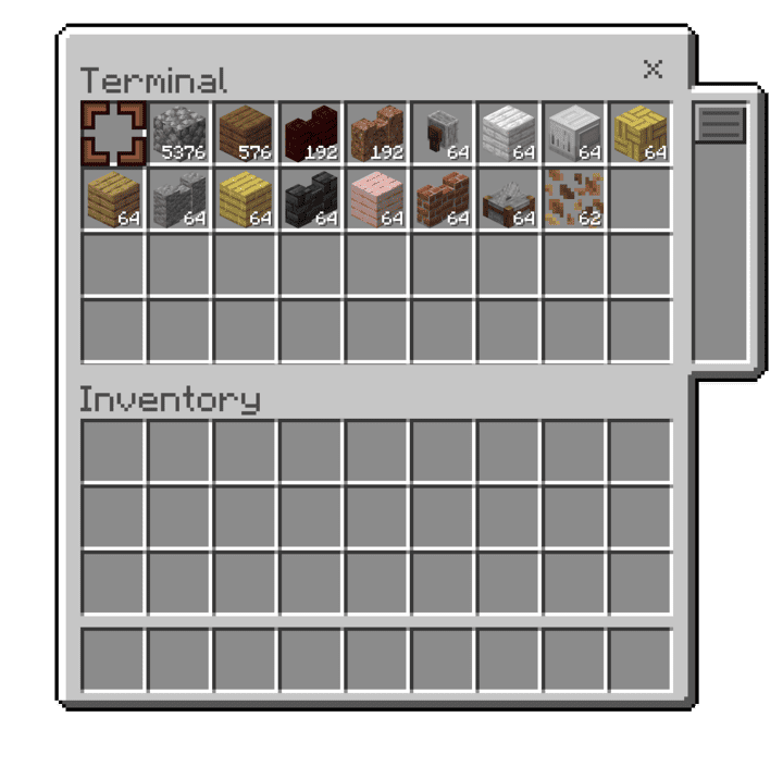 Your base will consist of the following components: terminals, disk drives, import/export tires and storage. All items are stored in disks placed inside the disk drives. Through the terminal you can view, retrieve and add items without having direct access to the chests. This is especially useful in large projects and automated Minecraft PE (Bedrock) bases.