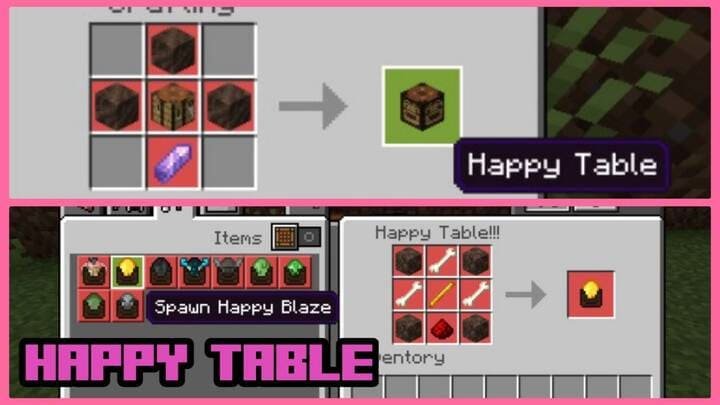 To start using Happy Mobs, you need to create a Happy Table. To do this, combine 1 workbench, 3 blocks of soil and 1 amethyst. With this table, you can "transform" normal mobs into their happy version. For correct operation in Minecraft PE (Bedrock) enable all experimental settings.