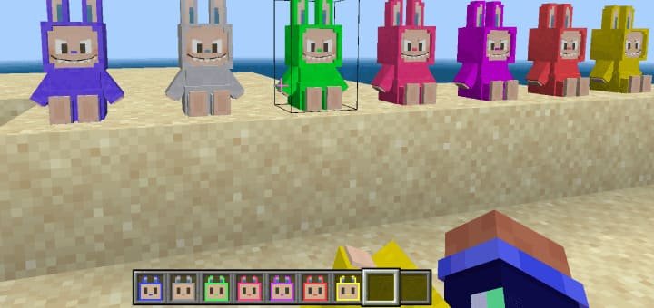 Labubus is a decorative mod for Minecraft PE (Bedrock) that adds 7 rare collectible figurines, each of which can be found with a small chance of killing certain mobs. It is also possible to craft and activate a special box from which a random Labubu will fall out.
