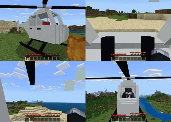The Helicopters mod for Minecraft PE (Bedrock) adds the ability to create and fly your own air transport in survival mode. Now you can quickly move between biomes, explore the world from a bird's eye view, and even transport small amounts of resources.