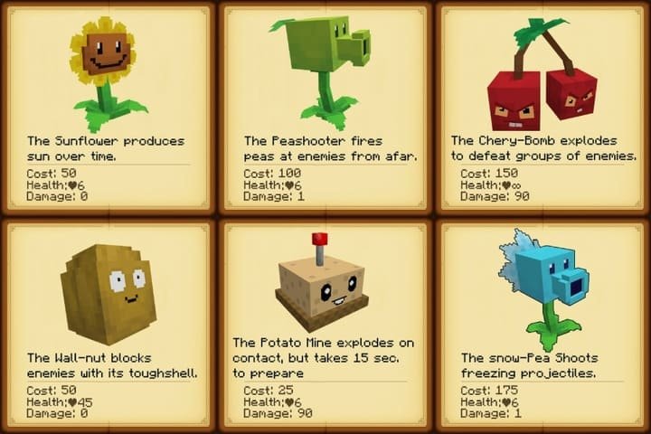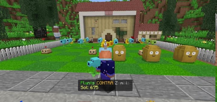 The map recreates the atmosphere of the original game with full mechanics of collecting sun, selecting plants, and reflecting waves of zombies in the world of Minecraft PE (Bedrock). It features unique models, voice acting, and musical accompaniment. Players will have to complete 8 missions, each of which unlocks new plants and challenges.