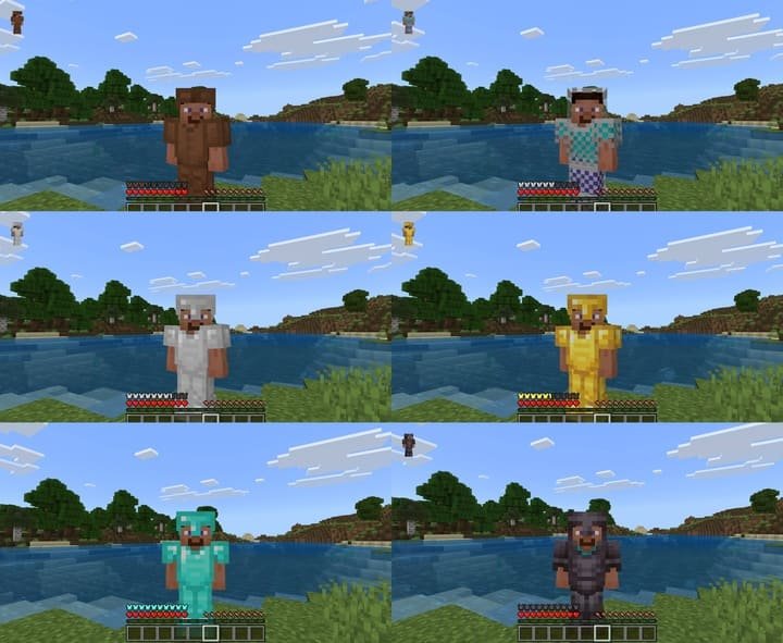 The color of the armor bar will match the material of your equipment in Minecraft PE (Bedrock). Currently, the following types of armor are supported: leather, chainmail, iron, gold, diamond, and nizerite. This allows you to determine at a glance what type of protection your character is wearing.