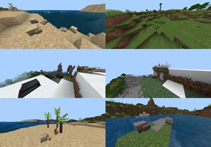 You will find new resources all over the world. Berry bushes and fibers, stones of various sizes, river stones rich in metal, as well as new trees — palm trees. In the mountains, you can find deposits of glass and obsidian. All of this is necessary for creating new equipment and surviving in the harsh prehistoric world of Minecraft PE (Bedrock).