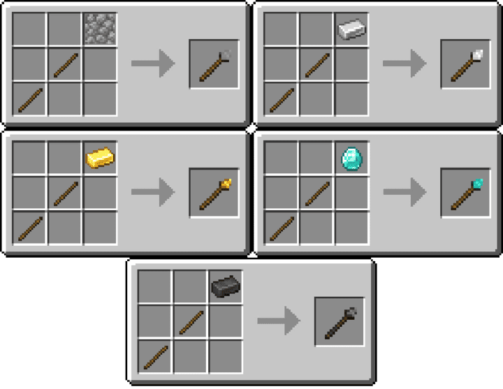 This mod is optimized for both survival and creative modes, offering different behaviors depending on the game mode. The main advantage of the mod is its full compatibility with achievements, which means that you can use its full power without sacrificing the ability to earn game rewards. Sticks are crafted from various materials, and the rarer the material, the more blocks the tool can place at once in Minecraft PE (Bedrock).