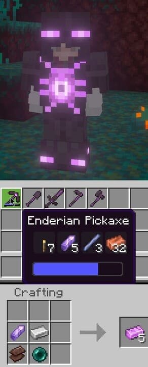 The Endarian ingot is crafted from amethyst, iron ingot, echo shard, and Edge pearl. A full set of this armor in Minecraft PE (Bedrock) allows you to mark a location in the air and teleport to it by crouching twice. Each piece of armor grants immunity to Slowness, and tools can store items like pouches.