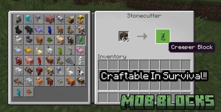 All you need to do is place a block of sand in the stone cutter. After that, a complete list of more than 50 available mob blocks will appear in the stone cutter menu. All you have to do is select the statue you want and take it. This simple method allows you to quickly create a large number of decorations for your buildings in Minecraft PE (Bedrock).
