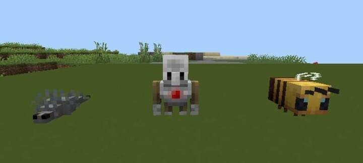 You will have access to all types of wolves, cows (including mushroom cows), chickens, pigs, rabbits, parrots, and axolotls. You can create a whole pack of wolves of different colors or a tropical corner with colorful parrots. In addition to standard animals, the mod also adds bees, goats, and many other creatures.