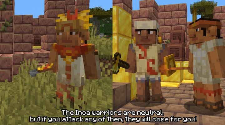 In addition to the boss and neutral creatures, the mod adds an entire community of Inca warriors and a new animal native to the Andes to Minecraft PE (Bedrock).