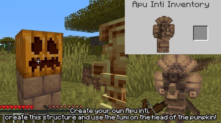 Using the Tumi you’ve obtained, you can create your own guardian—the ceramic golem Apu Inti. To do this, place a block of clay bricks, place a pumpkin on top of it, and right-click (or long-press) on it while holding the Tumi in your hand. Apu Inti will protect you from enemies and can use melee weapons. Furthermore, you can place him to turn him into a guardian statue for your items.